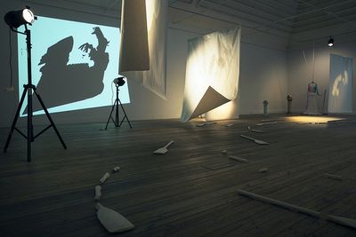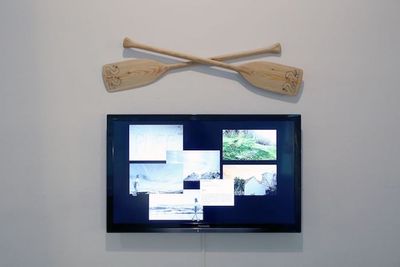 The door of the gallery is imagined as a hole, a suction. Like in a plane, if the door (security) breaks open all objects get aspirated, sucked out. What is the movement of this aspiration, of this suck (instability). We have made a RIP-tide of small decorative paddles, flowing from one door. Some of these paddles are functional made in hardwood, others replicated with moulded plaster. The latter would dissolve in water like an aspirin. Translucent oil (permanent dew) and acrylic prints on paper that show stains of women working at out-dated apple computers and incorporate sentences from Mother Teresa’s ‘dark (crisis of faith) letters’, are sucked into the second doorway. These faithless works are suspended low, drifting and exposed. There are many surviving bodies in this superstitious current. Contributors Camille Roy and James Whittingham are both represented in the exhibition as colourful smiles exchanged in the restless black&white flow. In which we try to turn thought into object and object into language. Space becomes time, place becomes mind. Lucky 22 x